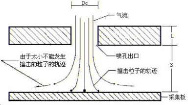 圖1給出不同空氣動(dòng)力學(xué)等效直徑的粒子在人體呼吸系統(tǒng)中的沉降部位,采樣器的設(shè)計(jì)盡可能模擬這一特性。慣性撞擊原理早在五十年代就已經(jīng)提出來了。圖2給出一個(gè)噴孔附近粒子運(yùn)動(dòng)軌跡的示意圖。在一定的氣流速度時(shí),一些慣性較大的粒子將撞擊到采集板上,而那些慣性較小的粒子則隨氣流繞行而進(jìn)入下一級(jí),在噴孔的幾何尺寸和氣流速度一定的條件下,不同空氣動(dòng)力學(xué)等效直徑的粒子其撞擊概率是不同的,其特性可用撞擊效率曲線,一般常用撞擊效率為50%的直徑值作為這一級(jí)撞擊器的截?cái)嘀睆剑⒓僭O(shè)空氣動(dòng)力學(xué)等效直徑大于截?cái)嘀睆降牧W訉⒈?00%地撞擊。
